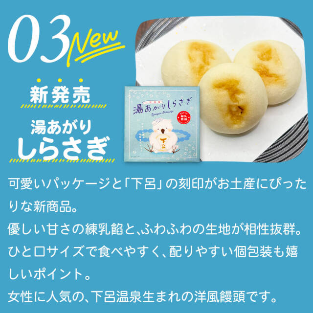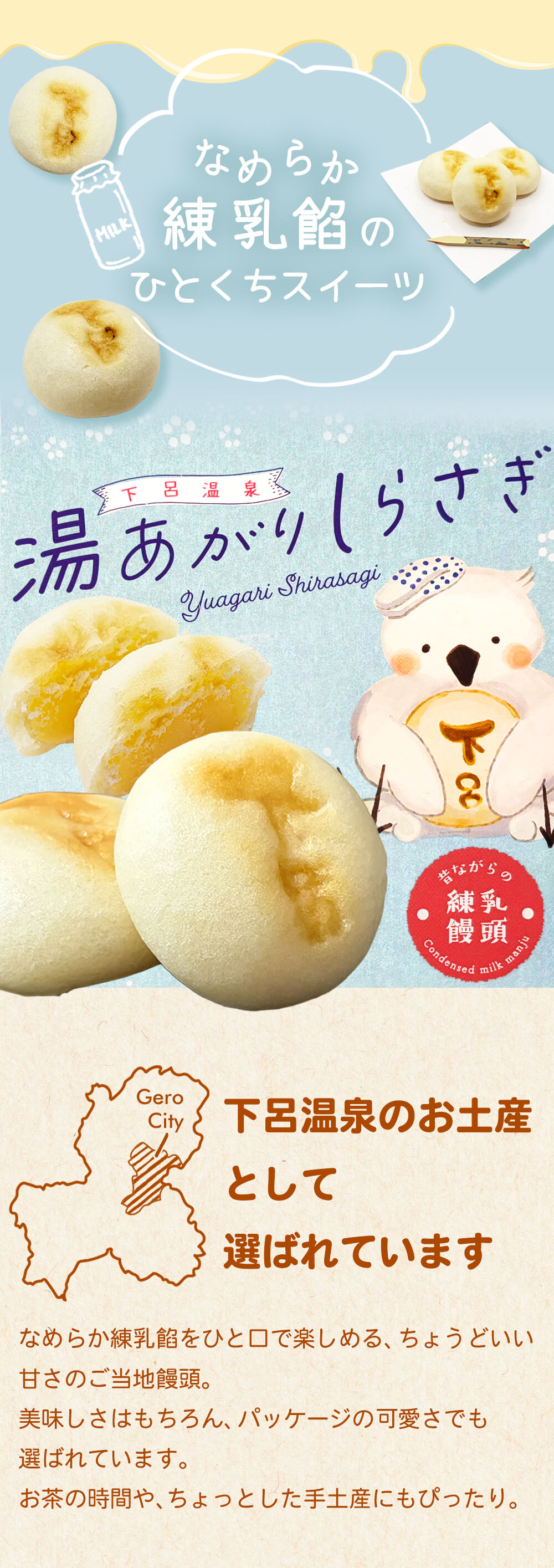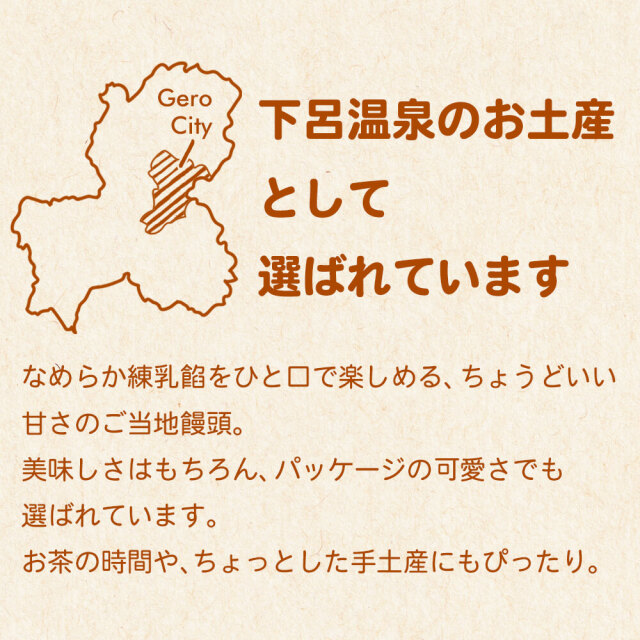 なめらかな練乳餡を包んだご当地練乳饅頭です。練乳のしっかりとした甘さはありながら、後味はくどくならず、口どけの良い餡がやさしく広がります。やさしい色合いの可愛らしいパッケージは、思わず手に取りたくなるデザイン。ちょっとしたお土産にも!