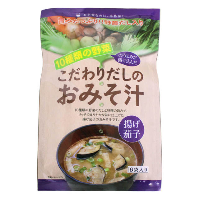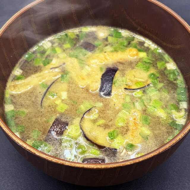 お手軽なのに本格派!10種の野菜の旨味が溶け込んだ、揚げ茄子の即席みそ汁。