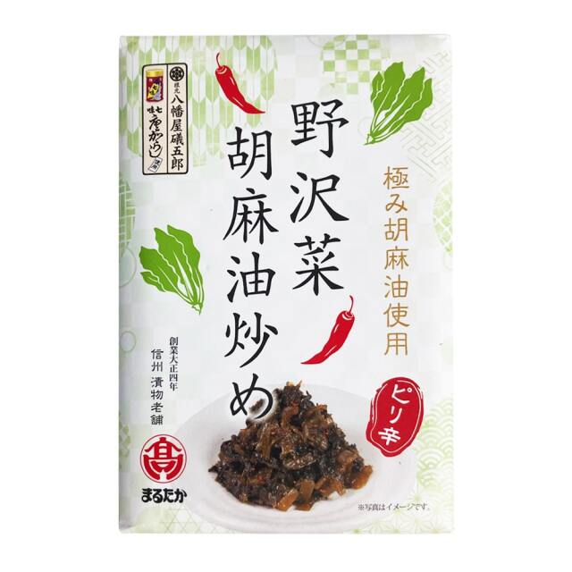 【原材料名】野沢菜 (国産)、大根、醤油、砂糖、発酵調味料、清酒、かつおエキス、ごま油、七味唐辛子、麦芽糖、食塩、ぶどう糖、風味原料(かつお節粉末)、コラーゲンペプチド、寒天/ソルビット、調味料(アミノ酸等)、重曹、酸味料、酸化防止剤(V.E)、増粘多糖類(一部に小麦・大豆・ごま・ゼラチンを含む)【内容量】150g