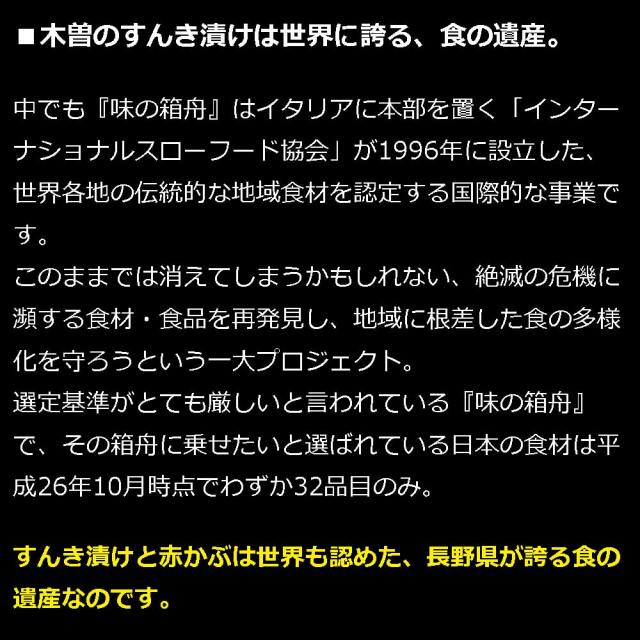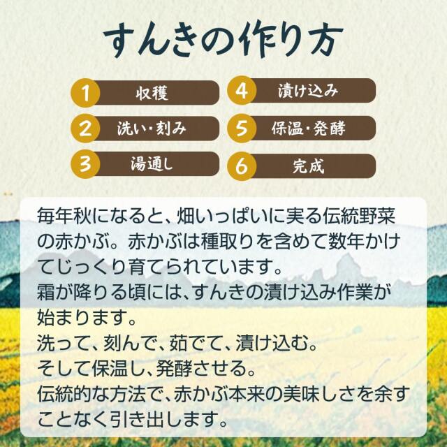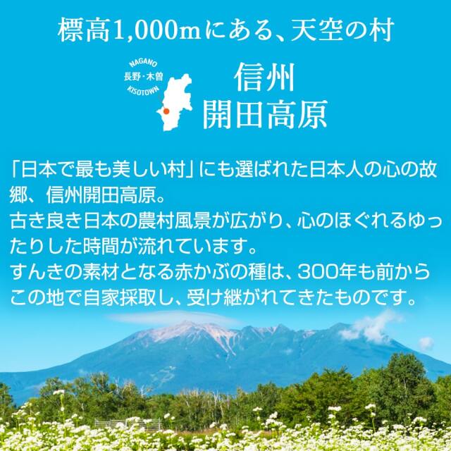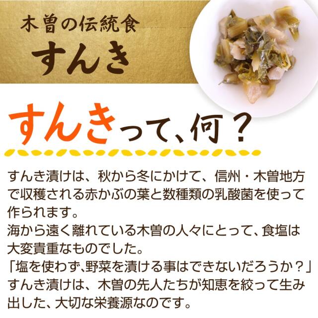 信州飛騨の特産品通販TOP 漬け物 野菜・果物野菜 信州の特産・名産漬け物 ※こちらの商品は冷蔵便・産地直送商品です。他商品との同梱はできません。 標高1000mの開田高原産の赤かぶを使用したすんき。 乳酸醗酵のみで味付けした漬物なので、塩分を気にせずにお召し上がり頂けます。 お味噌汁やピザに合う酸味がたまりません。 商品詳細 【内容量】200g×2袋 【原材料名】赤かぶ(長野県木曽町開田高原産・開田かぶ) 【賞味期限】90日。 冬季限定 開田高原産 すんき(2袋セット)/12月中旬~発送// 木曽 赤かぶ 無塩 すんき漬け 開田 お歳暮 【2025年度予約】 価格: ¥1,700 (税込) [ポイント還元 17ポイント~] 予約期間: こちらは予約商品です: 【重要】ページ内発送予定日を要確認 選択してください 確認しました。 ★同梱不可:支払方法限定:直送★: 選択してください 他商品は別途送料追加です のし付: 選択してください のし不要 無地のし お中元 お歳暮 熨斗その他(通信欄へ) メッセージ添付(通信欄へ) のし名入れ: メッセージ: ラッピング: ラッピングが必要な方はお選びください 選択してください 包装不要 個別に包装 まとめて包装 数量: セット 在庫: ○ 在庫 ○ 商品別の返品条件を確認する 5.0 (6件) 他にもこんな商品があります 《冬季限定》信州コンクール優秀賞 柚子チョコレート ゆず姫 /泰阜村 ゆず 柚子 柚子ピール 柚子チョコ チョコ チョコレート // バレンタイン 2026 ギフト ¥1,728(税込) 市田柿 化粧箱 信州産 20個入 秀ランク 使用 /12月下旬~発送// ブランド干し柿 ギフト 干し柿 干柿 長野 高森町 お歳暮【2025年度予約】 ¥5,897(税込)